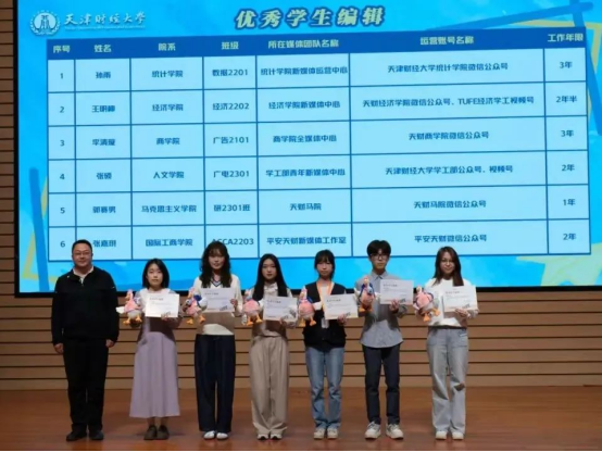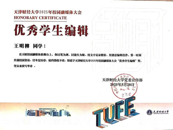 色漫天堂新媒体中心主任王明柳同学荣获“优秀学生编辑”称号。作为TUFE经济学工视频号的负责人,王明柳同学带领新媒体中心媒体部的成员,精心雕琢每一部作品。这些作品巧妙融合多元创意元素,每一帧画面都倾注着心血。这一荣誉不仅是对王明柳同学辛勤付出的高度认可,更有力彰显出色漫天堂