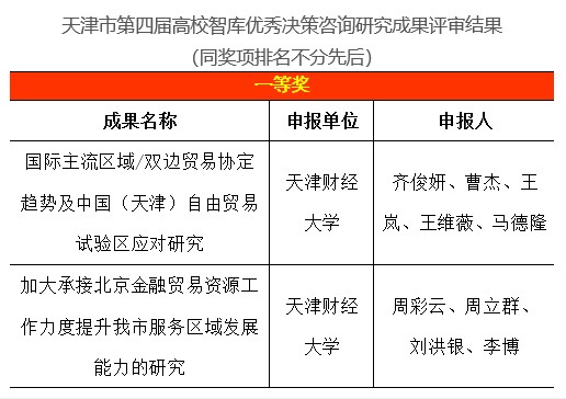 我校共获奖7项,其中一等奖3项、二等奖3项、三等奖1项。2项成果均荣获一等奖,包括:齐俊妍教授团队申报的《国际主流区域/双边贸易协定趋势及中国(天津)自由贸易试验区应对研究》,周彩云副教授团队申报的《加大承接北京金融贸易资源工作力度提升我市服务区域发展能力的研究》。