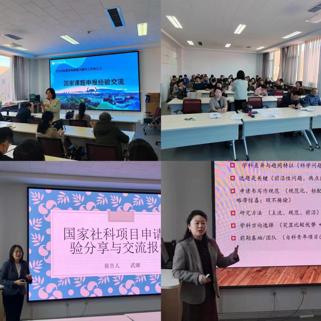 于2023年11月10日下午在N4-211开展“教学科研能力提升工作坊”第三期活动“国家课题申报经验交流(一)”。会议邀请刘娟教授、武娜教授进行经验交流,学院全体教师参加,旨在通过优秀教师的科研经验分享,形成学院互帮互学、团结上进的科研氛围,带动老师们共同进步。