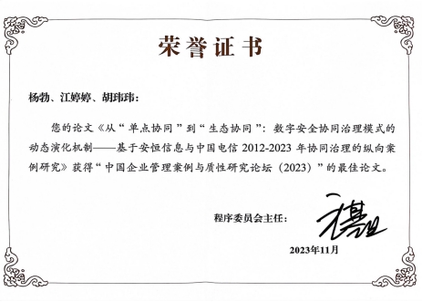 教师杨勃副教授的论文《从“单点协同”到“生态协同”:数字安全协同治理模式的动态演化机制——基于安恒信息与中国电信2012-2023年协同治理的纵向案例研究》荣获最佳论文奖。