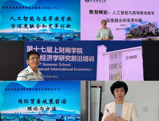 李阳子老师以“数智赋能:人工智能与高等教育教学深度融合和变革创新”为题,介绍了Chat-GPT4等生成式人工智能迅速崛起给高等教育教学带来的变化和挑战,并结合自身的智慧课程建设展示了如何使用超星泛雅智慧教学平台构建课程知识图谱,使用AI助教和其他AI工具提高高效教学的方法和路径。杨宏老师以“国际贸易政策前沿理论与方法”为题,向大家分享了上海财经大学主办的国际经济学研究前沿培训的内容,结合自身研究方向总结展示了贸易政策量化评估与国际贸易中的贸易政策量化与市场失灵的模型框架及数据测度、碳排放与贸易规则一致性、动态一般均衡模型在地方政府基础设施投资和储蓄借贷方面决策中的应用、动态空间均衡模型在贸易政策动态效应中的应用等前沿理论与方法,并在此基础上,总结了以上前沿理论与方法在本学科各领域的借鉴与应用前景。
