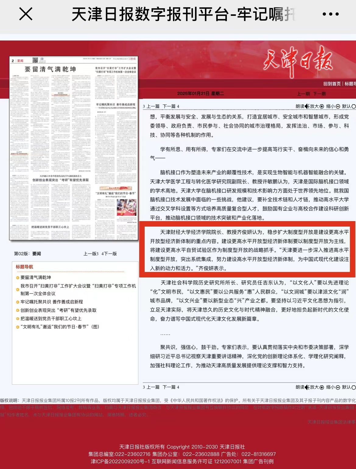 《天津日报》2025年1月21日报道《牢记嘱托聚共识 善作善成启新程—— 学习贯彻习近平总书记视察天津重要讲话精神座谈会侧记》链接: