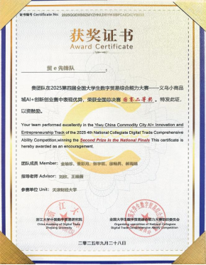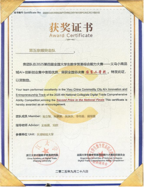 全国大学生数字贸易综合能力大赛由浙江大学中国数字贸易研究院主办,已连续成功举办四届,累计吸引1213所高校、60000余名师生参与。本届大赛的“义乌中国小商品城AI+创新创业”赛道深度联合义乌中国小商品城大数据公司,基于义乌小商品市场的商贸资源和Chinagoods平台的数字贸易基础设施,鼓励大学生与市场企业深度链接。赛事自2025年1月启动以来,吸引了全国309所高校的2279支团队、10229名学生参赛。其中,我校由金立智等五名同学组成的“第五象限突击”队荣获该赛道二等奖及义乌AI创业之星奖;金瑜珍等五名同学组成的“贸e先锋”队同样荣获赛道二等奖。