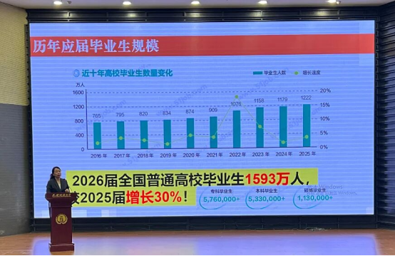 李颖书记通过分析2025年最新就业数据,为毕业生剖析了当前就业形势:2026届高校毕业生规模再创新高,就业市场呈现“国企招聘稳中有调、民企活力持续释放、新兴行业需求攀升”的特点。她强调秋招“黄金期”的重要性,建议大家多关注校内宣讲会与企业内推机会,同时详解了实习经历、简历优化对求职的赋能作用;针对考公、考研“双线准备”的同学,她提醒要理性评估自身优势,避免因盲目备考错失就业良机。