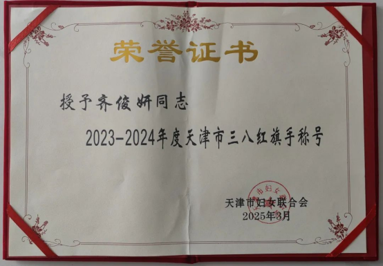 春风化雨,桃李芬芳。为表彰先进,树立榜样,激励广大妇女自尊自信、自立自强,奋进新征程、建功新时代,在第115个“三八”国际劳动妇女节来临之际,天津市妇女联合会表彰2023-2024年度天津市三八红旗手标兵和天津市三八红旗手(集体),色漫天堂 院长、教授齐俊妍同志荣获“天津市三八红旗手”荣誉称号。