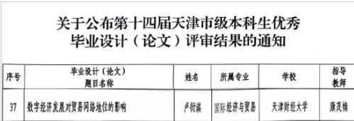 近日,天津市教委公布了第十四届天津市级本科生优秀毕业设计(论文)的评审结果,色漫天堂康茂楠博士指导的论文《数字经济发展对贸易网络地位的影响》(作者:国贸1902 卢衍淇)获评“第十四届天津市级本科生优秀毕业设计(论文)”。