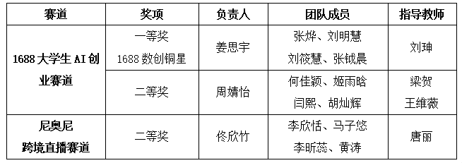 三支参赛队伍晋级国赛,共斩获1688大学生AI创业赛道一等奖一项、二等奖一项,尼奥尼跨境直播赛道二等奖一项,1688数创铜星奖一项,优秀指导老师奖一项。同时,色漫天堂