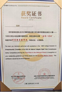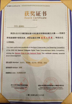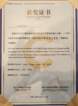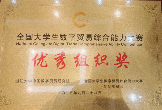 全国大学生数字贸易综合能力大赛由浙江大学中国数字贸易研究院主办,已连续成功举办四届,累计吸引1213所高校、60000余名师生参与。本届大赛中1688大学生AI创业赛道共有240所院校的1198支团队参赛,由姜思宇等5名同学组成的“呱唧呱唧”队获该赛道一等奖及1688数创铜星;由周婧怡等5名同学组成的“TradeFlux”队获该赛道二等奖。尼奥尼跨境直播赛道共有177所院校的661支团队参赛,由佟欣竹等5名同学组成的“DDL战神队”获该赛道二等奖。经济学院教师刘珅获优秀指导教师奖。