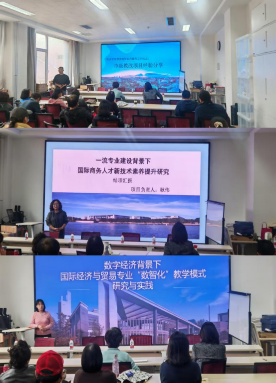 本次分享会邀请学院参加市级教改项目的2位骨干教师作为主讲嘉宾。刘欣老师分享了该项目的立项申报、建设成果主要内容、项目实施过程中取得的实践成效、成果特色及创新点。本项目以国家一流专业建设为背景,聚焦数字经济时代国际商务专业人才培养,对人工智能、大数据等现代信息技术在国际商务领域的应用进行了全面分析,在对政府部门、大型跨国企业、金融机构和跨境电商平台等充分调研和论证的基础上,提炼新技术素养需求下的专业培养目标,修订了国际商务专业培养方案。该方案聚焦学生的数据思维与数智技能,强化国际商务专业的分析和决策能力,培养自主学习和终身学习能力,旨在重塑新技术素养需求下国际商务专业课程体系和新技术课程与理论课程内容的深化融合。同时,还介绍了项目建设过程中构建的从课堂到校内外的多层次实践教学体系,及其在本科生科研工作、全国高水平学科竞赛和师资队伍培训与教学竞赛中取得的丰富创新成果。王维薇老师分享了我校国际经济与贸易专业积极推进“数智化”教学改革的经验,构建了“数实融合—产教融合—科创融合”三位一体的新型教学模式,取得了一系列阶段性成果。项目以“产—教—研—创—用”为主线,系统重构课程体系,提升课堂互动与教学效率。同时项目深化产教融合,推动学生参与学术交流与学科竞赛,全面提升综合素质与创新能力。此外,项目还注重“校—企—政—研”协同育人,实施“双导师制”,打造模块化、差异化的课程体系,为学生提供个性化发展路径。多项研究成果获国家级课题立项,师生论文在数字贸易论坛等平台频频亮相,教改成效获同行专家高度认可。该教改项目不仅提升了人才培养质量,也为新文科建设提供了可复制、可推广的“数智化”教学范式,具有较强的示范与引领意义。