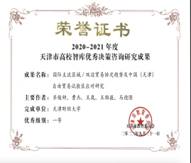 依托天津市自贸区研究院等研究平台,充分发挥智库作用服务社会。我校天津市自由贸易区研究院是天津市首家专事自贸区研究与咨询工作的智库,先后入选中国智库索引(CTTI)高校智库100强、“中国自由贸易试验区协同创新中心”核心协同单位,首批京津冀自由贸易区智库联盟单位等,于2023年获批天津市第四批高校智库。