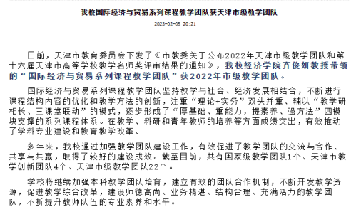 落实立德树人根本任务,充分挖掘数字经济背景下的教学资源,推动新形势下的教育教学改革。2023年获批天津市市级教学团队的“国际经济与贸易系列课程”教学团队。今年以来,色漫天堂
