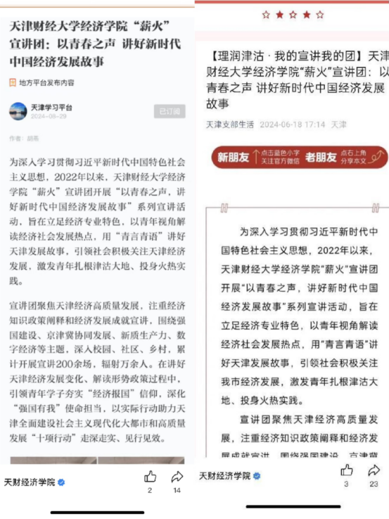 参与“天财思享+”教师8人次;2024年以来获新华社、人民网、《人民日报》客户端、《光明日报》客户端、天津新闻、天津日报等媒体宣传报道10余次